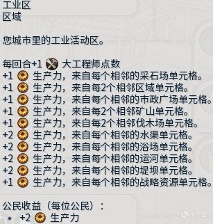 工业区:尽量邻接水渠、矿山等凑加成,主要看地块的产出和改良类型,并且尽量密铺。