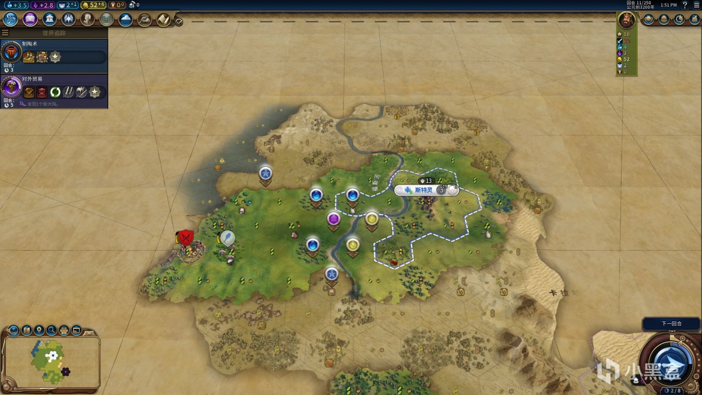 由于有山脉和礁石的加成,所以本图中建筑较为分散。以及通常前期圈地要比闷头种田更重要,选择打法还是要地缘环境。