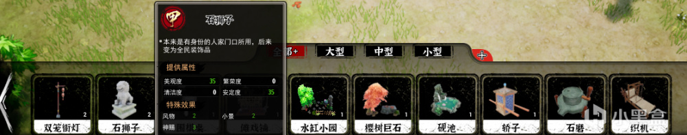 在摆件部分,除了建筑自带的摆件之外,《天神镇》还提供了单独的摆件选项,在摆件选项中有着更多的要素加入,比如说织机、石磨、轿子等古代人们常用来谋生的工具,还有砚池、石狮子这样过去大人家里才会摆上的物件。这些物件还将与周围的建筑形成联动,达成套装属性后,还将会有额外效果。