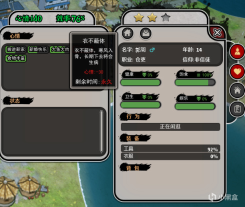 在游戏中,村民们具有着心情值、健康值、饱食值等多个属性,这些属性将主要依靠村民们当前的工作状态和生活状态来改变。当衣不蔽体时,村民会生病,会心情值降低,而在吃饱又吃好的情况下,则会心情大涨,工作效率也将随之提高。