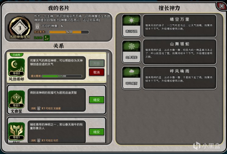 作为一款神仙题材的游戏,《天神镇》以其独特的神仙系统作为核心展开,衍生了一系列不同于其他模拟经营建造游戏的玩法。在《天神镇》中,玩家进入游戏后需要通过神权来选择一位神仙建立关系,而在可选的神仙中,有着不少我们熟悉的神仙均有出现,从掌管土地的土地爷,再到主管文运与考试的文曲星,还有诸如句芒、詹王这样很少听说的神仙,也在《天神镇》中均有出现,可谓是细节拉满。