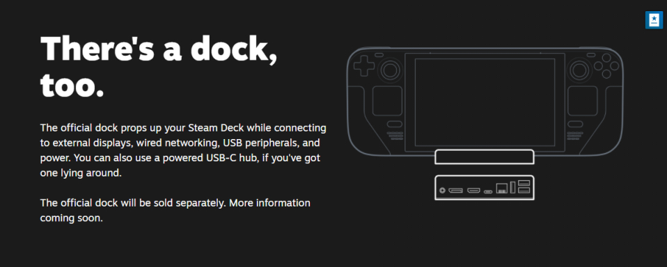 官方扩展坞“Steam Dock”在连接外部显示器、有线网络、USB 外围设备和电源的同时支持您的 Steam 平台。如果你身边有一个有源 USB-C 集线器,你也可以使用它。