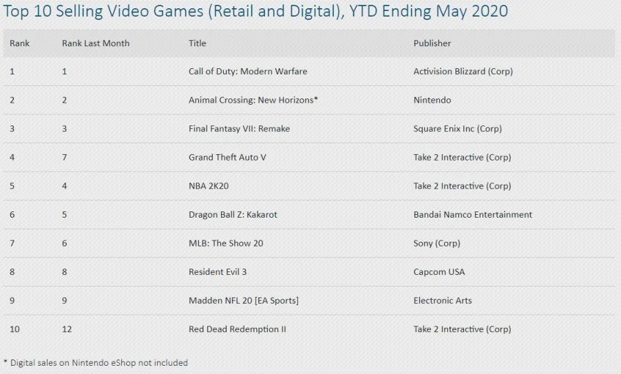 这点或许更需要数据的对比而非刻板印象,根据美国NDP集团在2020年5月发布的数据,美国该月销量前十的游戏有cod,nba2k20,MLB20(美国职业棒球联赛),麦登橄榄球20等竞技游戏。