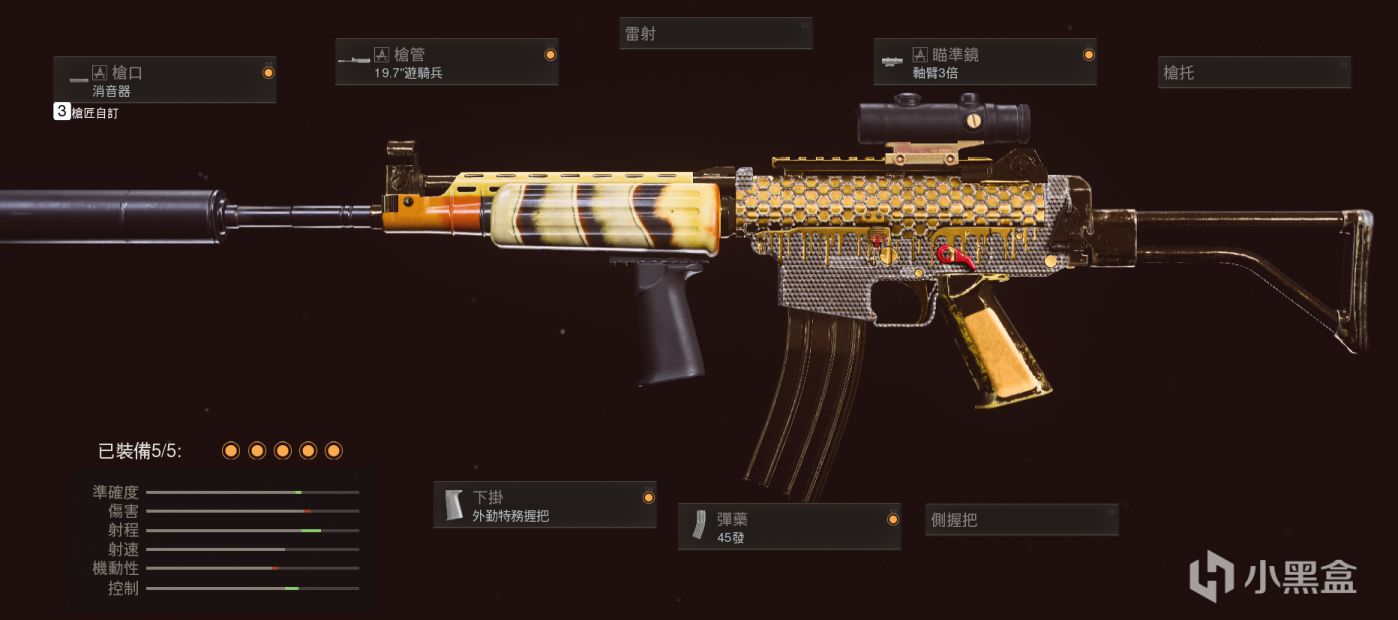 (满配默认为最常见的配置,即:普通消音+特遣队枪管+外勤特务握把+3倍镜+45弹匣)
