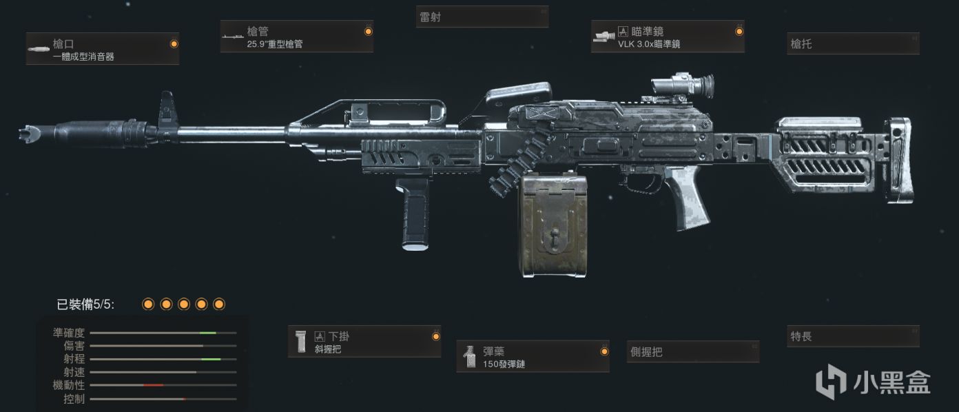机枪如果不苛求续航的话,弹匣可以换成滞空弹力/战术镭射,强化开镜速度和稳定性。