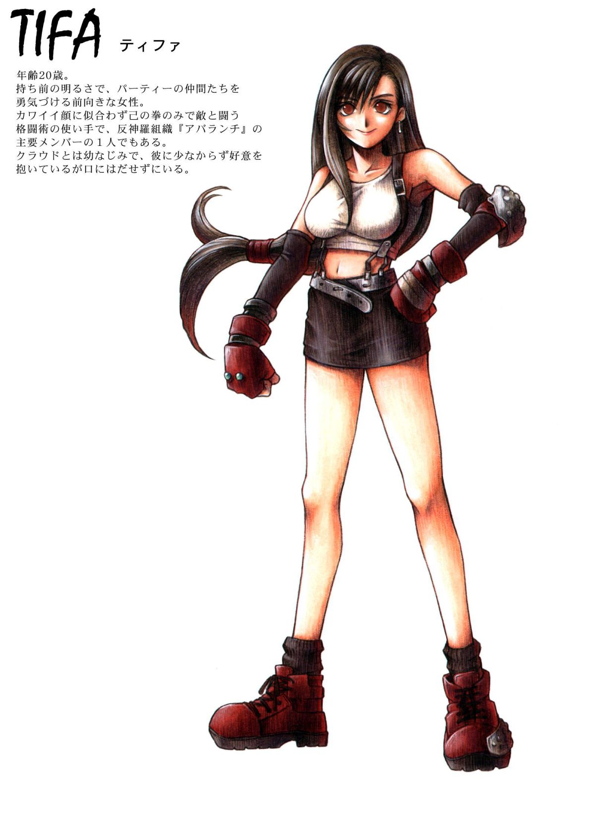 野村哲也在蒂法的形象设计上刻意与《最终幻想VII》中的另一位女主角 —— 艾丽丝作以区分。不同于身着长裙的艾丽丝温婉端庄的气质,蒂法的拳套、短靴等穿着要素无不彰显着这位女性格斗家的灵动与自信,而且在色气程度上也是超越前者数个等级。