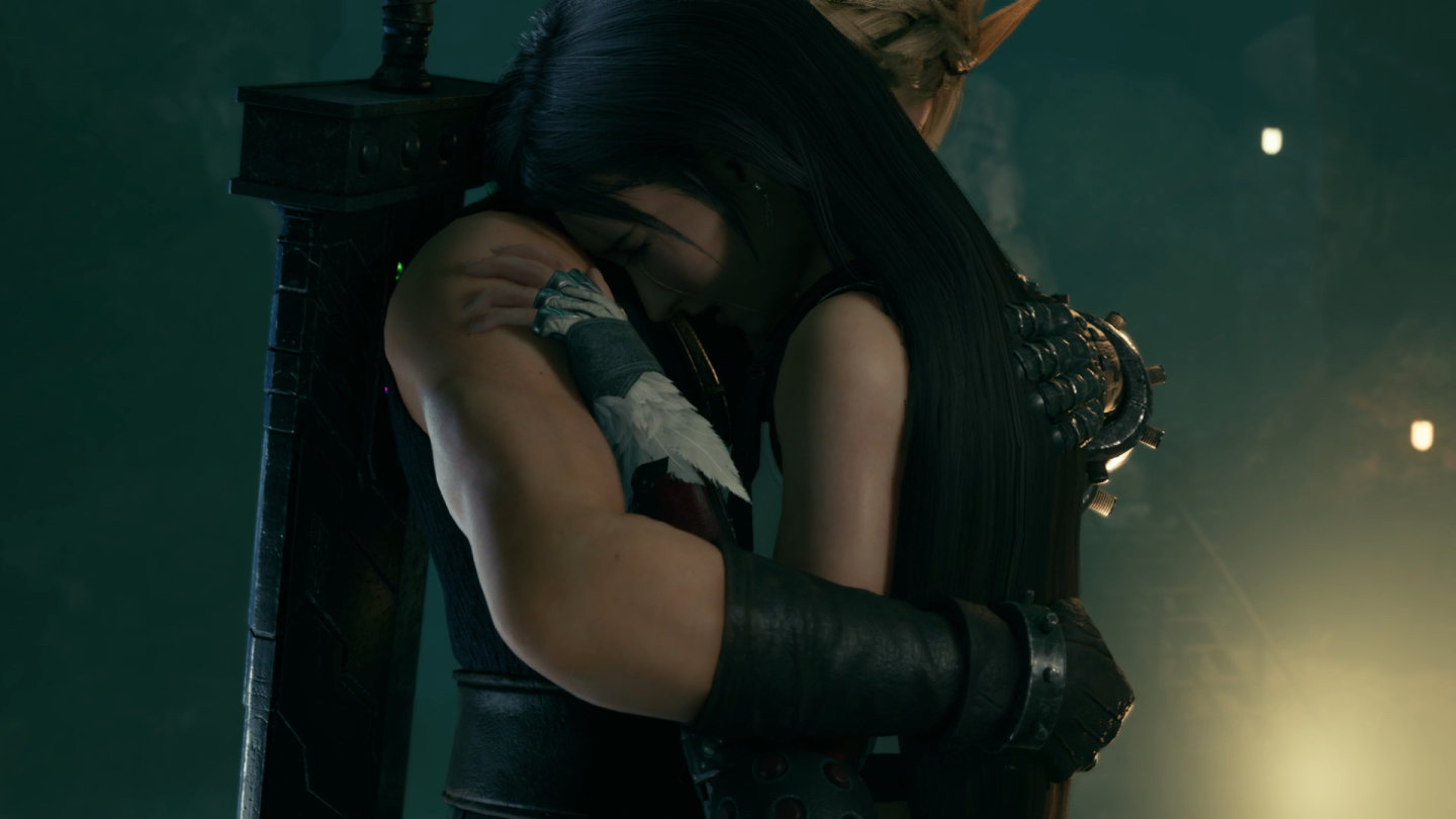 蒂法的故事是与克劳德深深绑定在一起的,这一对青梅竹马的故事贯彻了整个《最终幻想VII》系列,对于内心敏感且精神脆弱的克劳德,蒂法身上的那种坚定向前的乐观气质与自信阳光的性格深深影响着他,也同样感染着屏幕前的玩家们。两人之间交织的情愫在游戏中刻画的细腻而动人,他们从未露骨地表达好感,而是在一些对话、动作的小细节中难掩心底对对方的感情。