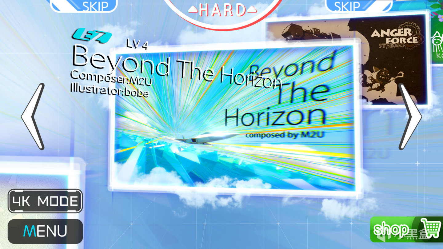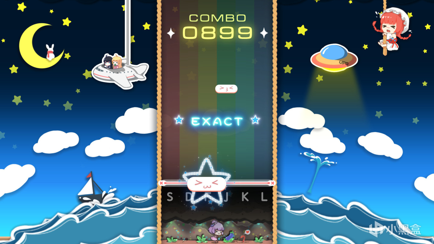 最后谈一下音游最重要的谱面问题—谱面编排和谱面数量。谱面只有EASY和HARD两个难度,难度一般加两个星左右,可以通过上下键切换难度,当然还有一些个性化的难度设置,例如自己调节速度。谱面编排方面,由于游戏操作只有单点和长按,游戏初期的四星即以下大部分还是相当容易的,高星则加快了速度和音阶密度,正常操作。