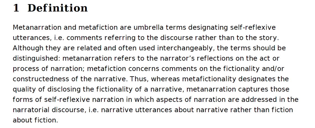 图1:The Living Handbook of Narratology对元叙事与元小说的释义