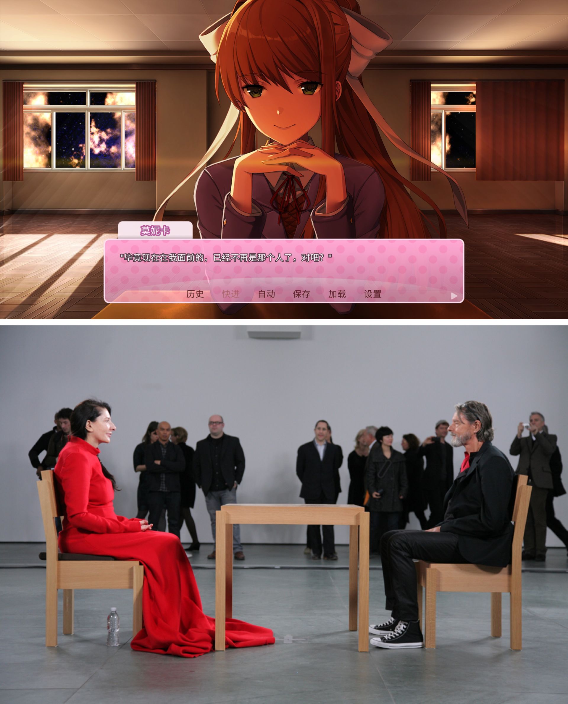 Marina Abramović是当代行为艺术的代表人物之一。在2010年纽约现代艺术博物馆(Museumof Modern Art, MOMA)举办的大型回顾展上,Marina带来了一部新的作品:《艺术家在场》(The Artist Is Present, 2010)。这件作品仅由一张桌子,两把椅子和Marina本人构成,想要体验这部作品的观众将坐在Marina对面,与这位艺术家相互对视。这是否让玩家们联想到《心跳文学部》里,被囚禁的玩家与Monika之间的对视呢?在凝视对方的同时也有被对方凝视的确然,这一简单无比的交互,是《艺术家在场》的母题,也是元游戏的重要特质。艺术家在场,既是在观众与参与者身份的复合中,对主题的自我探寻,也是借一个有意识的他者,使主体朴素的交流行为得到还原。在没有掩饰的镜像里,玩家在自己的凝视中捕捉到自己的心理活动,我们在与Monika的对视中确认了双方的在场。