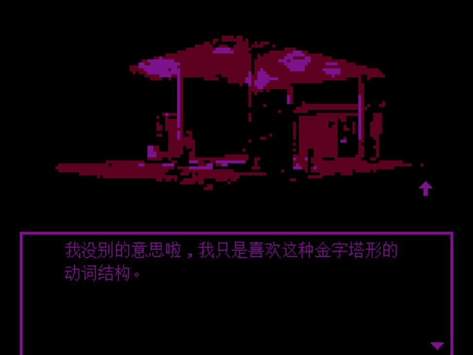 不难注意到,元叙事同时具有消解虚构和延展虚构两种截然相反的动力特征,这一点也直接反映到元游戏的叙事构成中。当叙事者个人化的叙述被拆穿,故事的真实性也就无从可考,虚构被暴露之时——这个既富戏剧性,又让人无所适从的瞬间——玩家并不知道它将如何运动。显形的虚构既可被当成此世经验的赝品,也可作为彼世生活的副本,以文本为起点,它同时坠落与上升。在游玩过程结束之前,这种运动都处在变化之中。元叙事的运动轨迹将最终决定元游戏如何吐露自己,以及如何实现与玩家,与世界的互动。