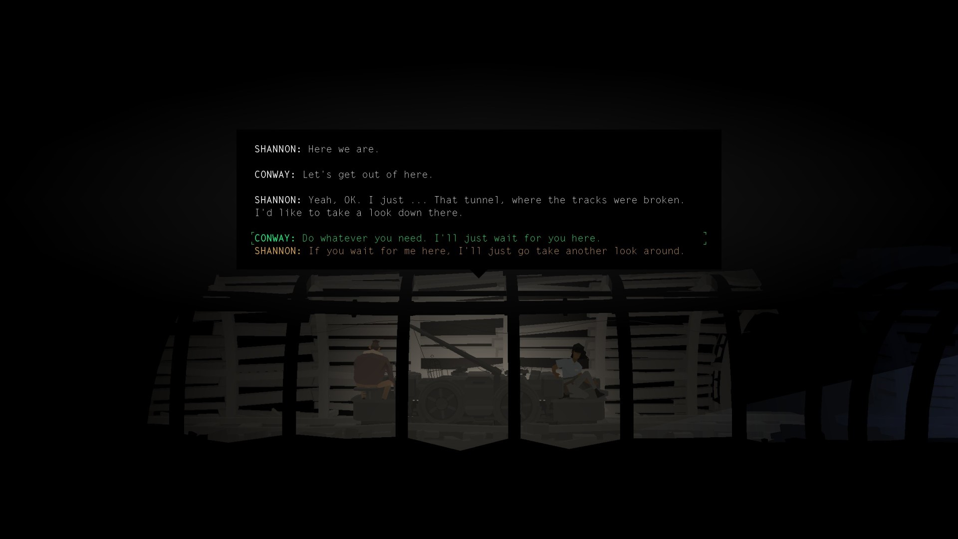 《肯塔基0号公路》(Kentucky Route Zero, 2013)则以纷繁的叙事技巧和诗性的表现手法颠覆了传统的元叙事。本作的主线剧情是古玩店的雇工Conway受老板兼朋友Lysette之托,欲将一份快递送往地图上不存在的地点Dogwood,得知前往此地必须途经肯塔基0号路,Conway在夜里踏上了旅程。游戏中通篇都是隐蔽的元叙事,通过非常规的情节表现,玩家察觉到故事在自身周围的溢出。本作最重要的元叙事手段,是对玩家和导演身份的刻意模糊。一般游戏的交互设置是强时态,重因果的,即玩家通过游戏叙事中已得知的信息来做推断,用行动实现自己想达到的效果。而在本作中,有大量交互选项是弱时态,淡联系的,即玩家并不知道选项中信息的真伪,但通过对选项的确认,创建了一个此前的既定事实。人物的个人经历、角色的命名甚至背景音乐的歌词,都是玩家自己在选择中塑形的。随着故事的深入,Conway的旅伴逐渐增多,面对不同的互动对象,不同角色的反应和言说都有差异,而这将影响对话的走向。玩家意识到自己并非是在控制Conway进行冒险,而是在巨大的虚构世界里调度人物和物件,亲自参与故事的制作和导演。