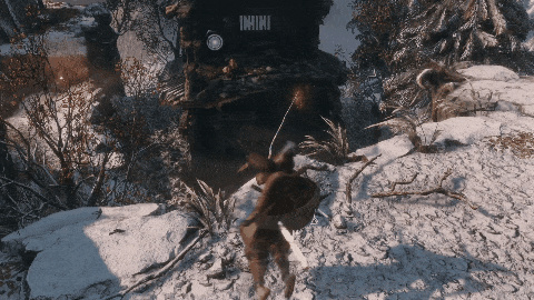 我们左转往下跳,然后钩锁吊着树往前荡