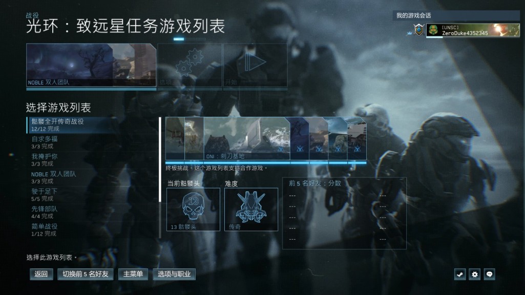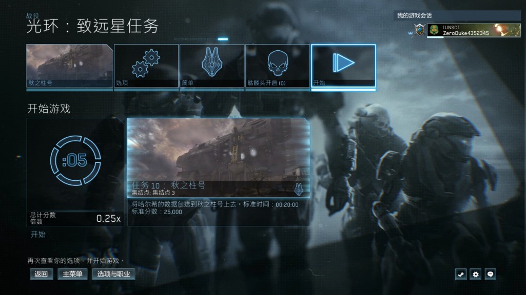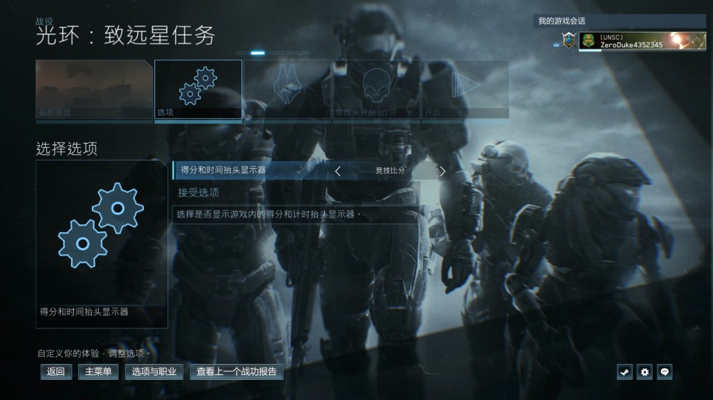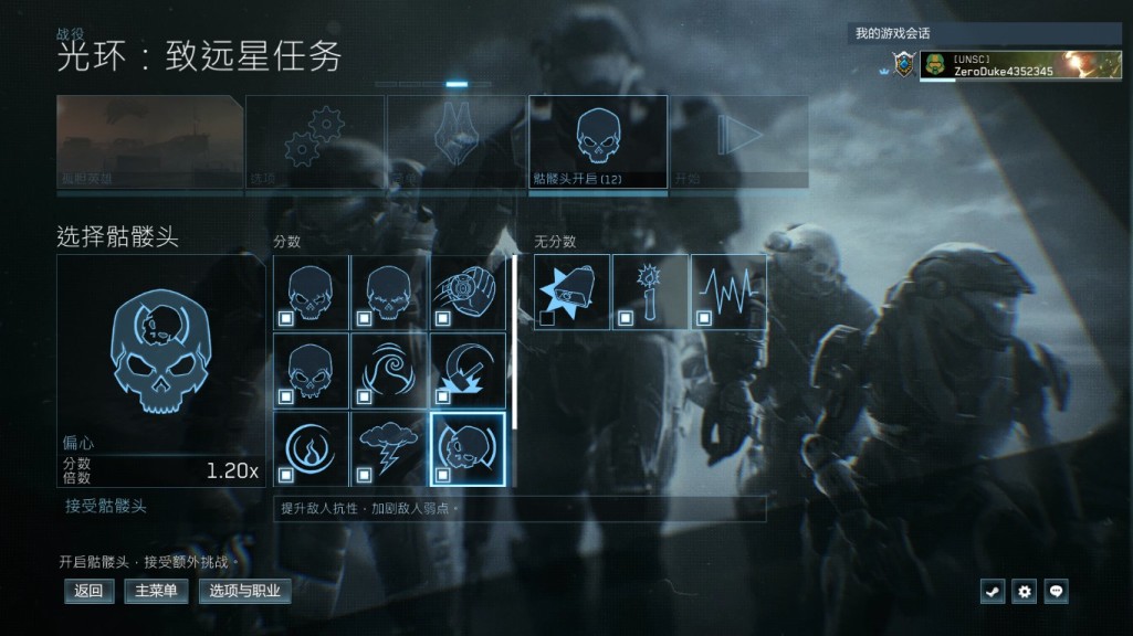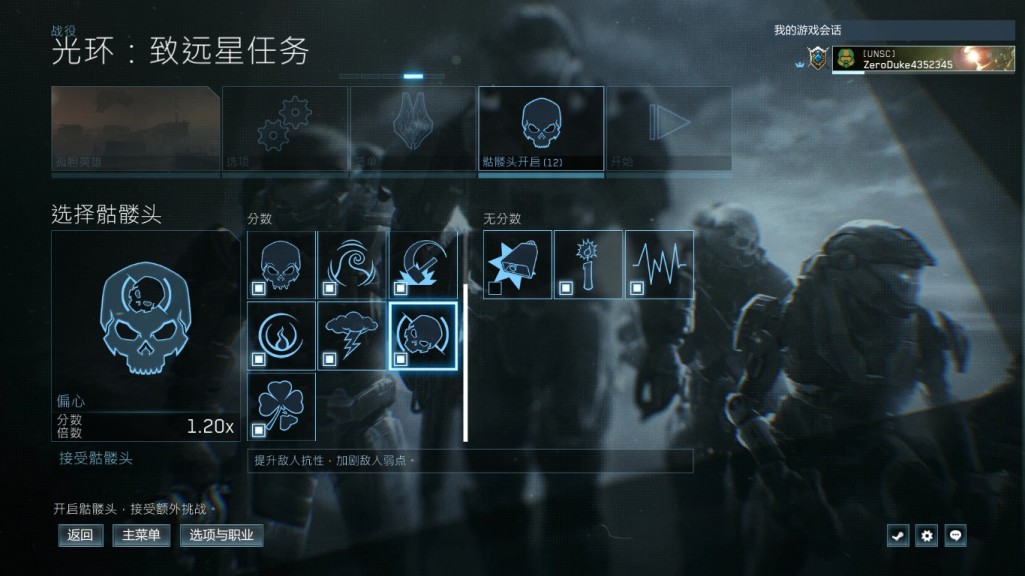 1:进入主菜单,点击战役,选择光环致远星,然后选择孤胆英雄关卡,难度简单,骷髅头设置看下图,在选项里把竞技比分打开(这个比分可以看到游戏结束时的比分),开始游戏。