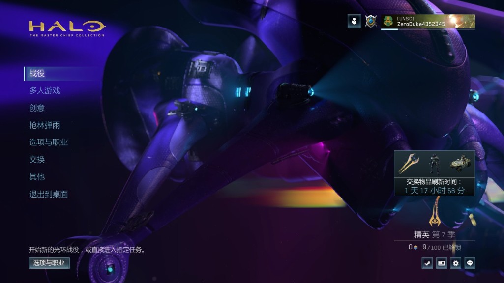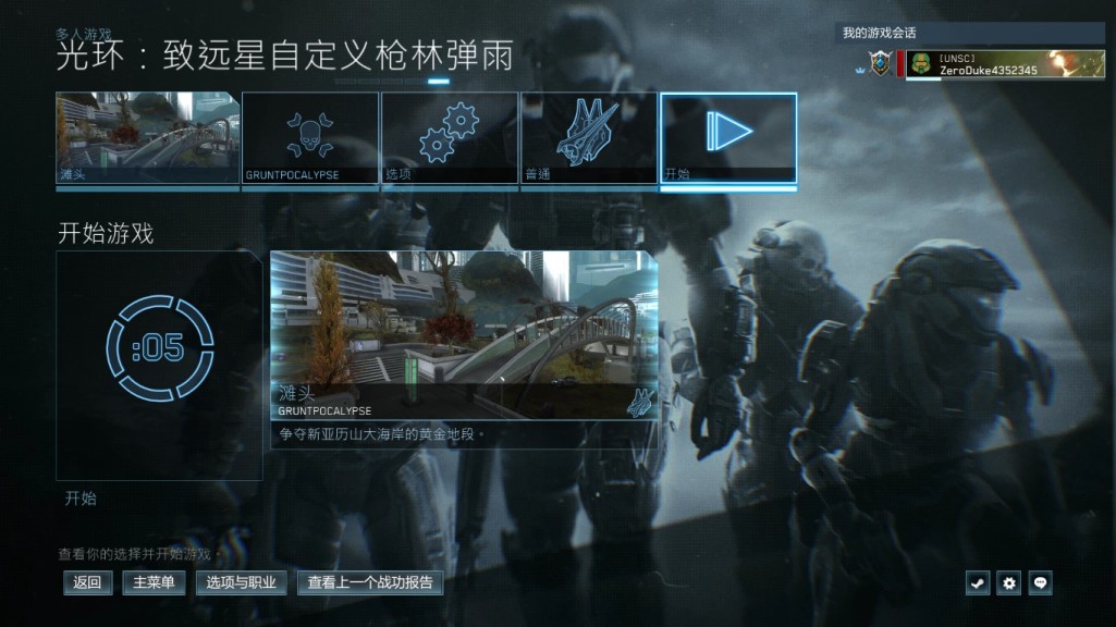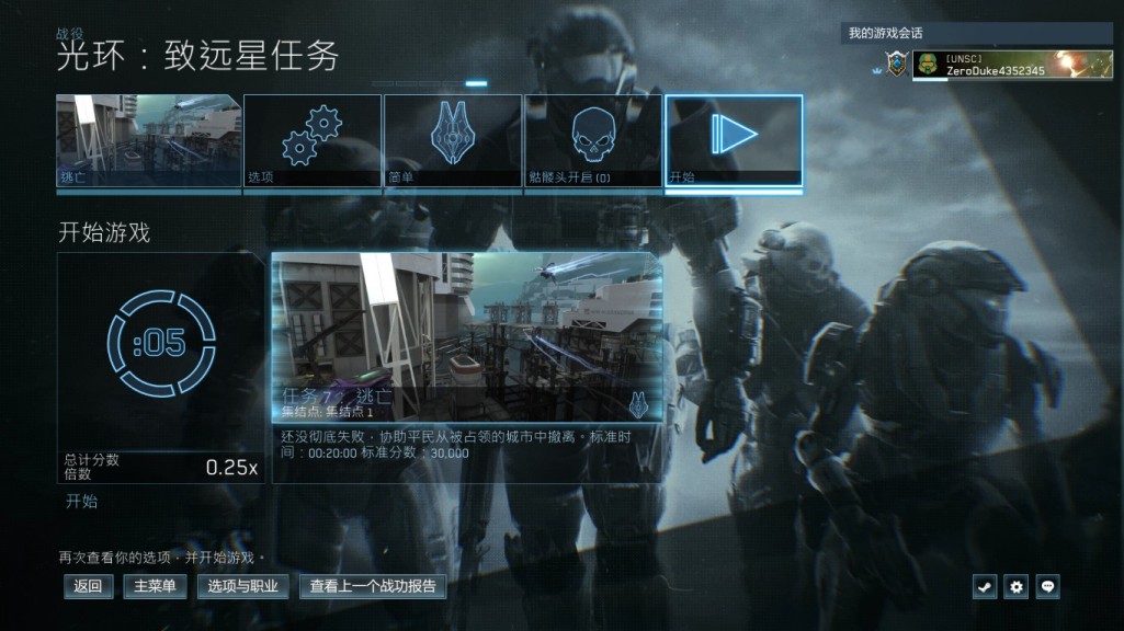 1:进入主菜单,点击战役,选择光环致远星,然后选择逃亡关卡,难度任意,集结点1,开始游戏。