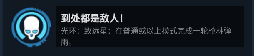 到处都是敌人!:光环:致远星:在普通或以上模式完成一轮枪林弹雨。