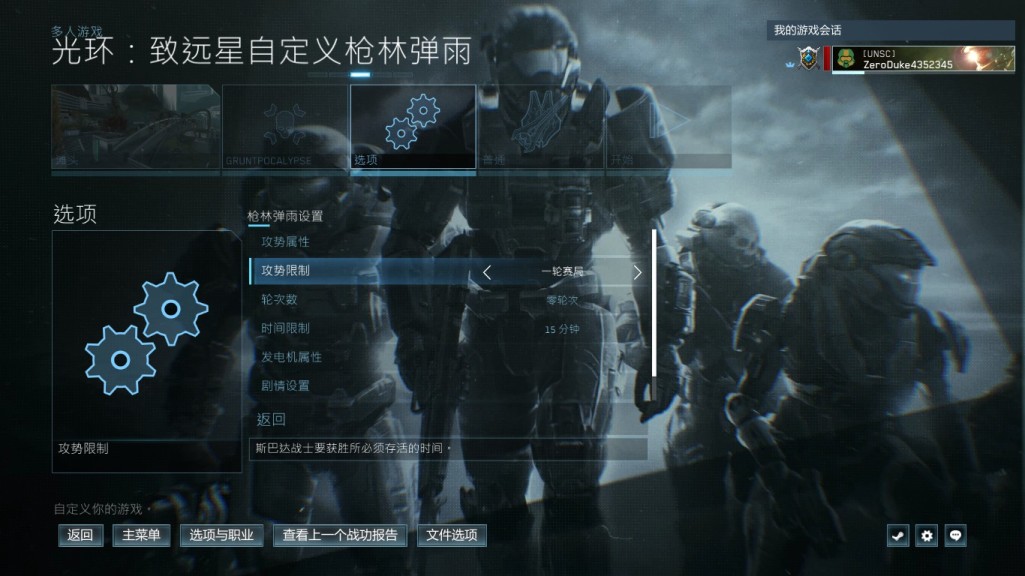 1:进入主菜单,选择枪林弹雨,自定义枪林弹雨光环致远星,选择地图任意,难度普通及以上,选项里选择枪林弹雨设置,一轮赛局,进入游戏。