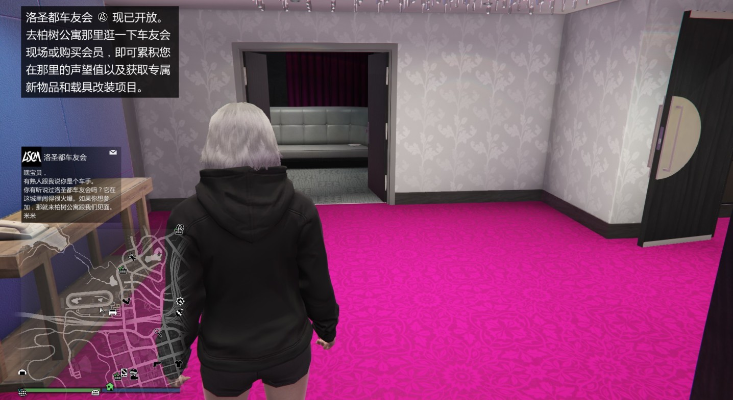 玩家在更新后登录游戏,可以收到来自洛圣都车友会的邀约,驱车前往柏树公寓附近,即可进入车友会举办地点