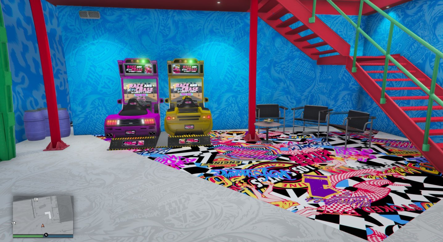 在二楼的楼梯下面摆着两款能飙车的游戏机,风格各异