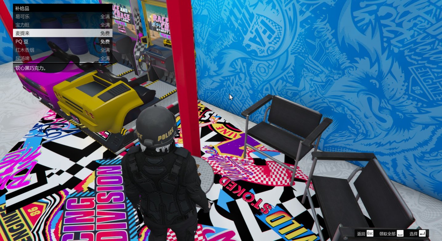 游戏机旁边还摆着个零食拿取点,方便玩累了吃点东西。现在可以一键拿满零食了