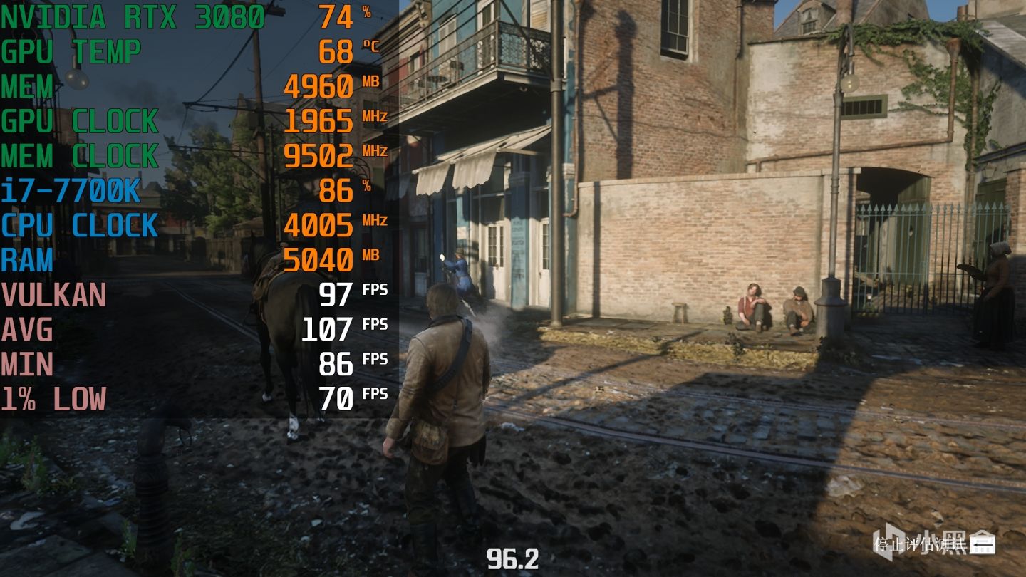 本次测试场景选取了游戏内置的BENCHMARK中的圣丹尼斯城场景,从室内抢劫,到室外骑马和JC对峙这么一个测试过程,虽然无法代表渲染压力最高的场景,但作为游戏日常场景帧数参考是没问题的,每款显卡测试两遍保证数据可靠性,这次测试是分为预设最高档(开、关DLSS)、全部拉满(只针对RTX 3090)以及针对GTX 1660 SUPER单独优化三种情况。