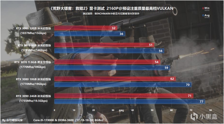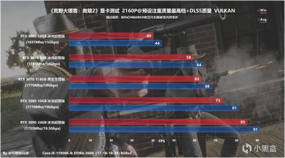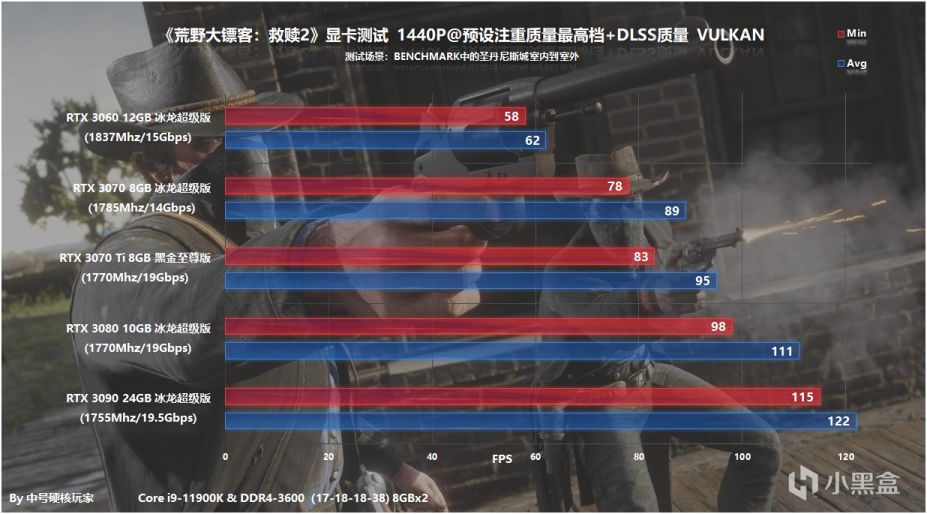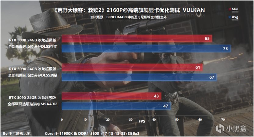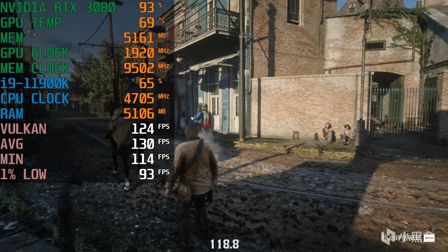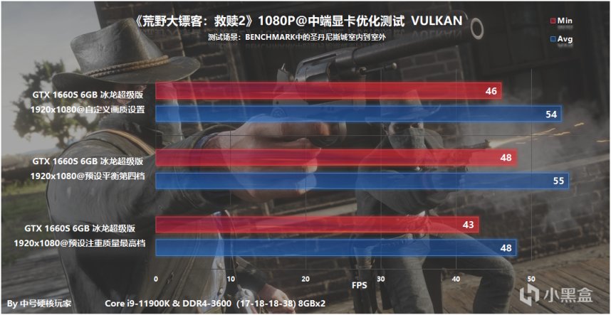 1080P分辨率,预设最高档的《荒野大镖客2》要求并不高,毕竟画面也摆在面前,甜品级的GTX 1660 SUPER也可以勉强达到平均48帧,而RTX 30系全系家族都能达到60帧完美标准的,尤其是RTX 3070以上,进一步开特效的余量空间还很多,不过这种显卡搭配1080P分辨率的玩家应该相对较少,有了DLSS意义就更不大了。