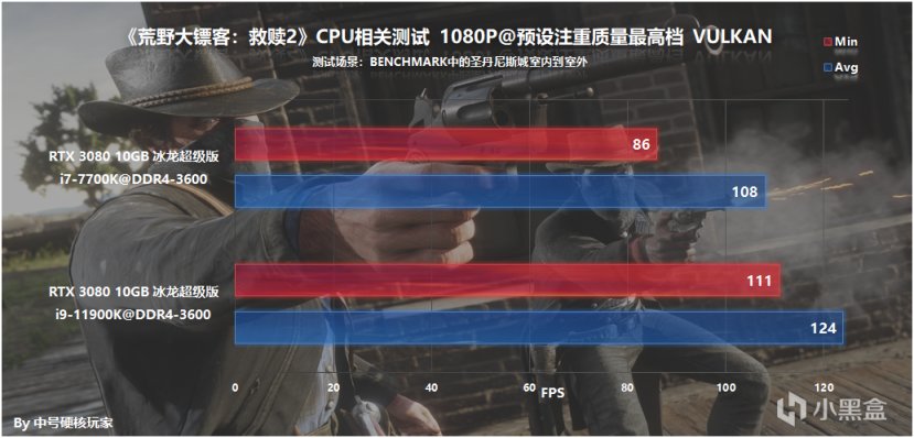 CPU测试使用i9-11900K关闭核心和调整频率来模拟,四核八线程的规格性能已经可以相当于超频之后的i7-7700K,内存频率是搭配的DDR4-3600频率测试的,《荒野大镖客2》作为一款大型沙盒游戏,对CPU会有一点性能要求,这种CPU测试的意义,更多是给那些低U高显的玩家参考(比如说暂时预算只够换显卡),作为过渡期看一看相对高端CPU会损失多少显卡性能。