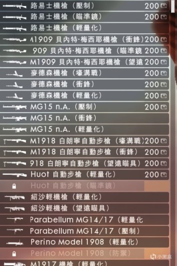 白朗宁m1918自动步枪:(中近距离表现优秀的一把步枪);MG14/17(高射速,极短的ttk,这把枪可以让你在近距离无畏突击兵);MG08/18(略慢于的射速,全距离作战)绍沙轻机枪:(优秀的射速,四枪杀人,其手感爆炸的好,但在现实战争中因为经常容易出问题所以被嫌弃)波顿:(两种子弹模式,高射速媲美汤姆逊,贴脸硬刚突击,按下v切换成燃烧弹可以对敌方飞机造成不俗的伤害,AA人专属武器)。支援还有一些比较好用的比如hout麦德森等 都可以自行体验。