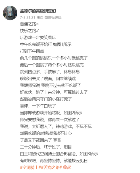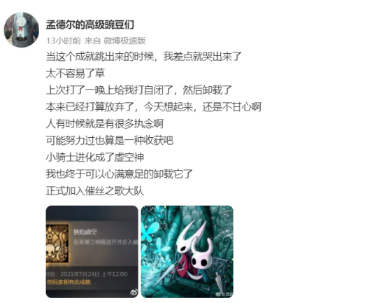 翻着我的微博和游戏截图,我写下了这些,记忆断断续续,写得可能也很乱,但不求别的,只愿几年后,一想到空洞骑士,那个执着的少年模样还能浮现出来。