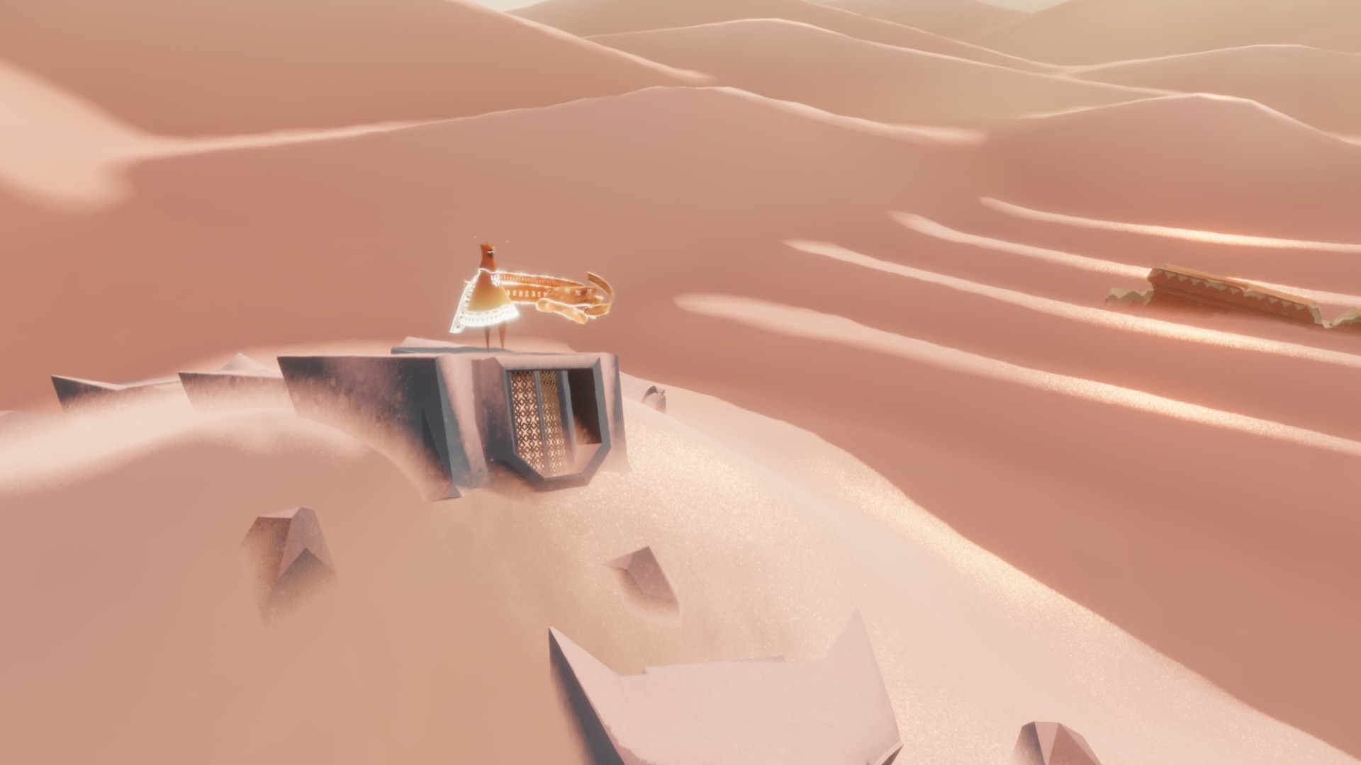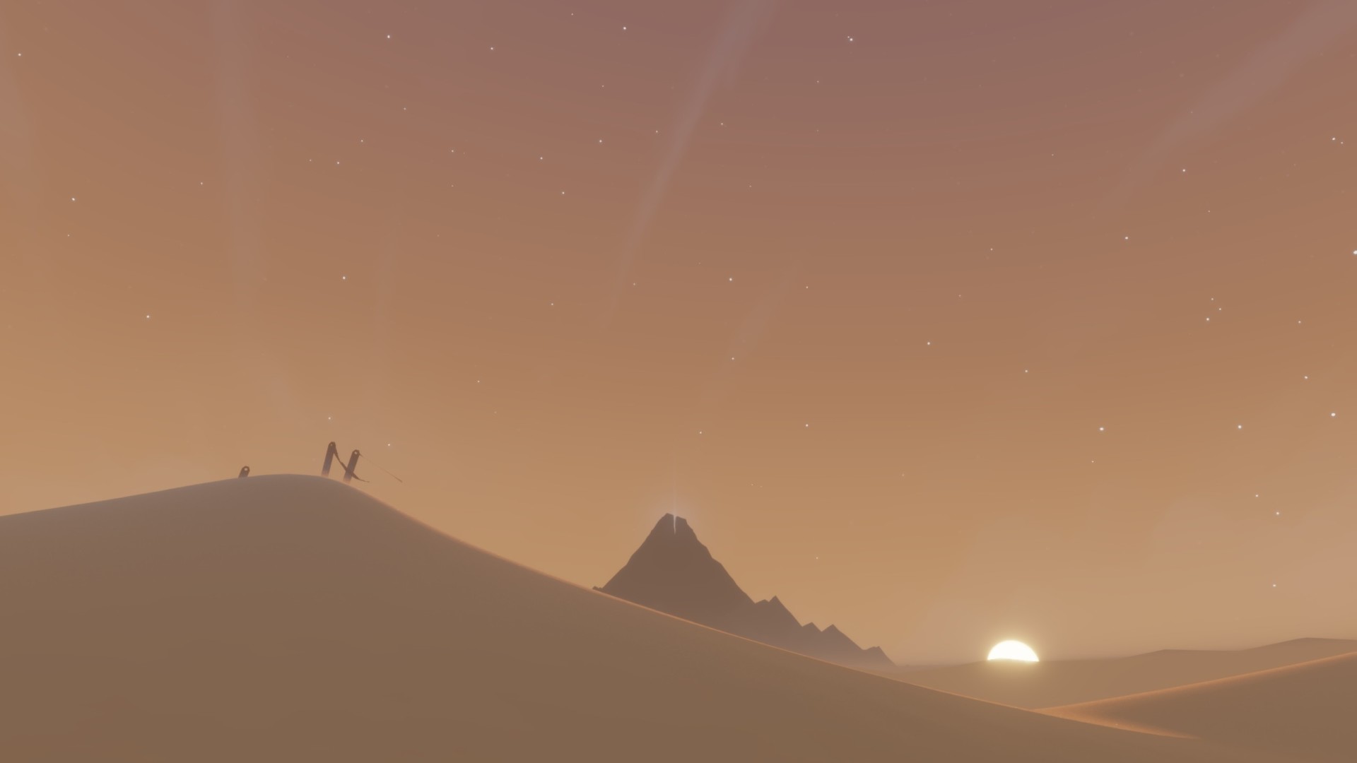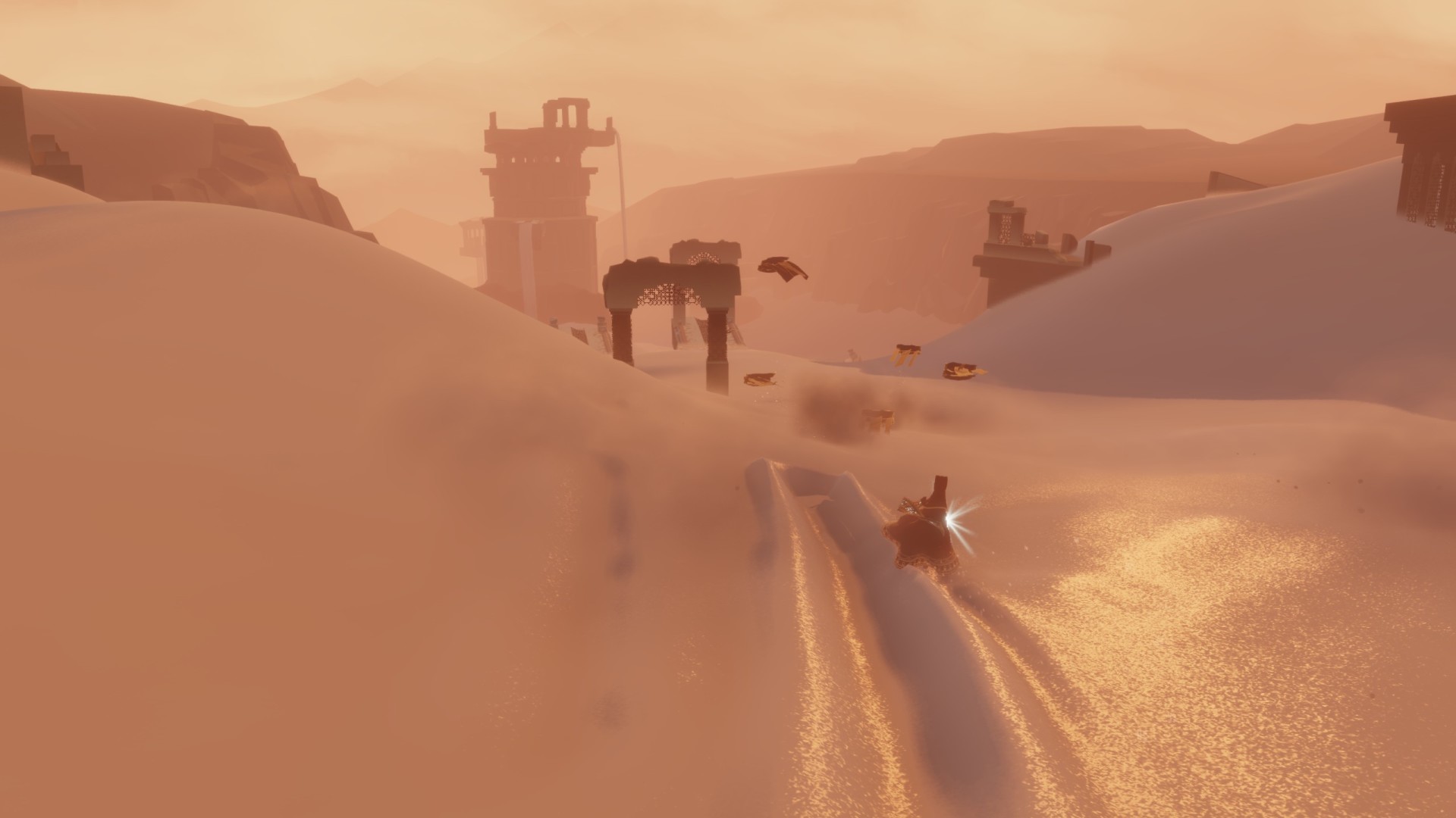 开场出生在沙漠,四周沙丘连绵,遮挡视线,唯独前方沙丘略显不同,似乎有东西,于是登上沙丘。