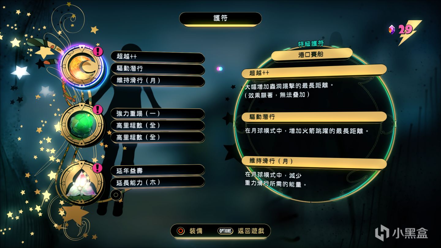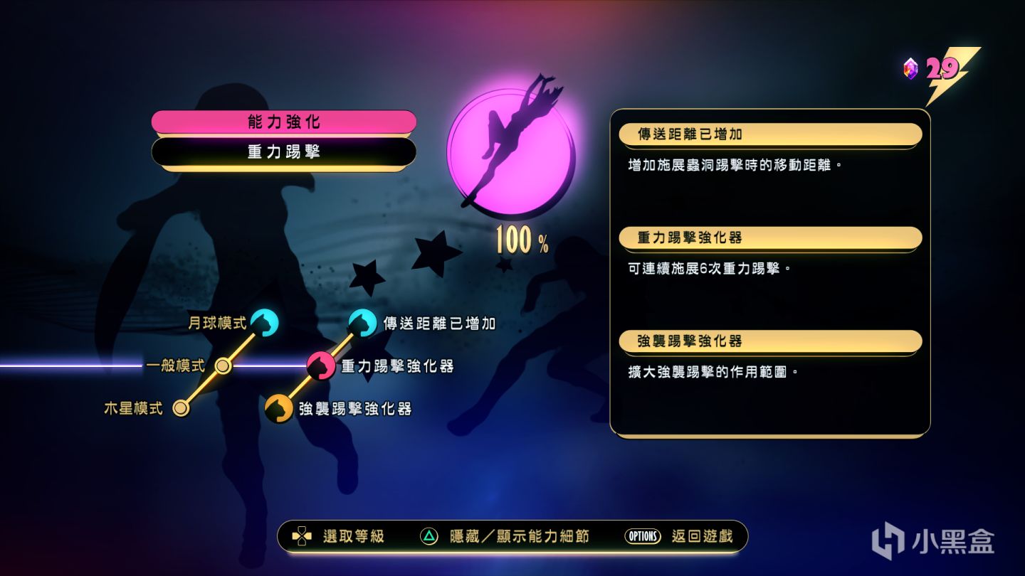 说真的这个游戏通关真结局,玩点重要npc支线,再佛系的玩点挑战,这大概就是最完美的体验了,可惜的是这个游戏的系统撑不起这么大的体量。比如之前提到的支线奖励,一般来讲支线奖励不外乎经验金币物品,完结篇的奖励则是经验和物品。完结篇的经验其实并不算重要,升级增加的是重力计量表和血量,然而困难难度且支线都不做的情况下这两样东西都完全够用,护符系统也是,只能说是更上一步,而且支线给的护符从功能性上来讲无一例外的拉跨。反倒是最重要的金币,也就是水晶,支线它不给。水晶的功能只有一个,就是给能力升级,其实主线过程中,能力不怎么升级也完全够用,但就是这个全能力奖杯,一共需要87000的水晶,挑战全金牌大概也就能拿到2w的水晶,其他的只能通过收集获得,满地图跑,水晶的单位分为1,10,50,然而地图上散布的基本都是1水晶,而且有人试过,地图水晶全收集也不够,那该这怎么办?很明显,需要去矿区刷,去打架,然而就像我说得,本作的良好战斗体验仅限于主线期间,还是很简单的战斗系统不足以让人刷上很长时间,更何况矿区的水晶也是按1计算的,要达到87000也是遥遥无期,最后只能通过重复游玩主线的某一关来刷水晶,快的话5分钟900个,算是最快的方式了,然而我还是刷了足足4个小时。