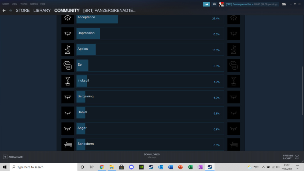 上图是游戏的成就界面。可以看到我没有刻意去做隐藏成就,在通关时只拿了5个必得的剧情类成就。隐藏成就的具体名称需要打开全体玩家成就数据才会显示。读者不妨观察一下这几个单词:Acceptance,Depression,Bargaining,Denial,Anger。这五个单词就是解读Gris剧情的核心。按适当顺序排列后,他们对应了游戏中不同颜色代表的各章节。