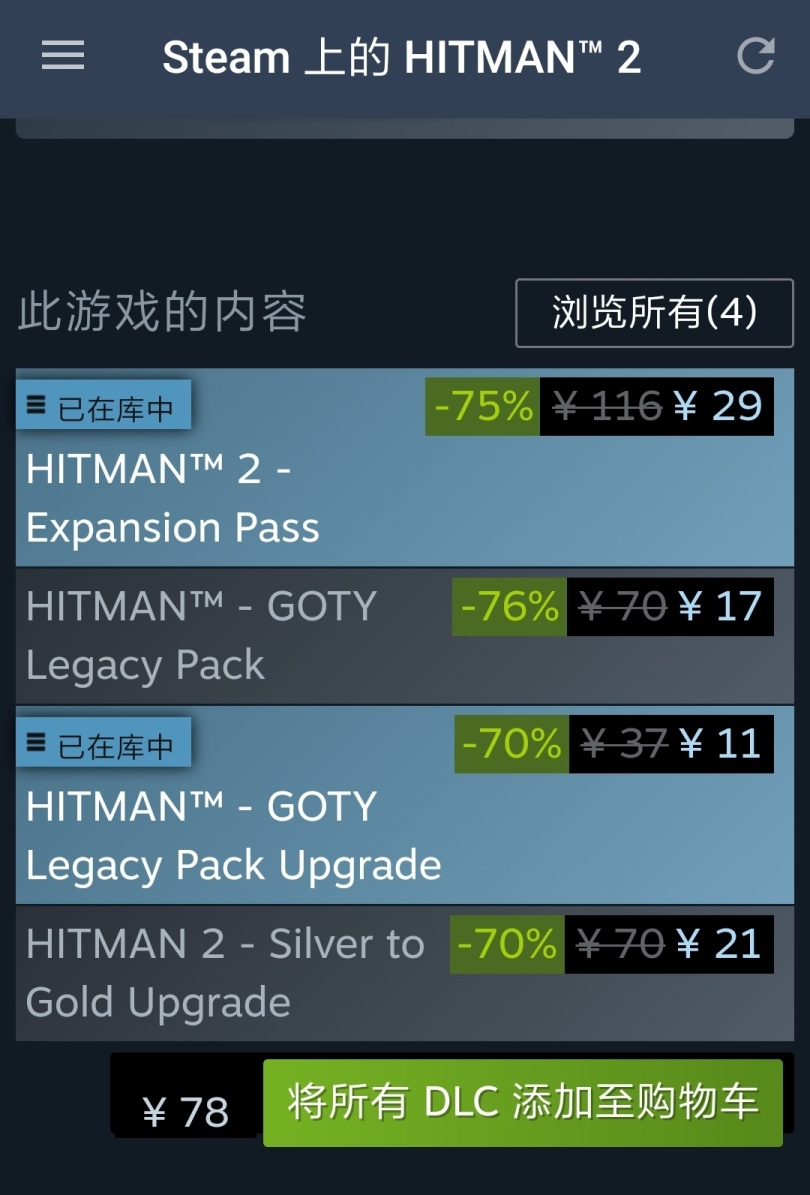 4、白银包。针对于在游戏发售之初购买了HITMAN™2白银版的hxd(目前该版本已经在steam商店下架),将白银版升级为黄金版。这个dlc大概没有多少人需要买了。白银版即是在标准版基础上多了半张季票的内容,没错是“半张季票”,因为只多了1张地图,季票的一半内容,所以需要升级成完整的季票内容。