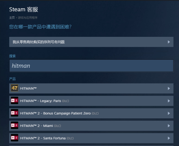 在客服-游戏与应用程序里搜索hitman,然后下拉找到HITMAN™2