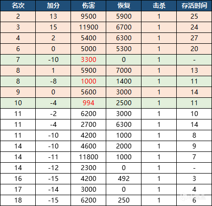 图片根据名次排序,绿色为伤害不足
