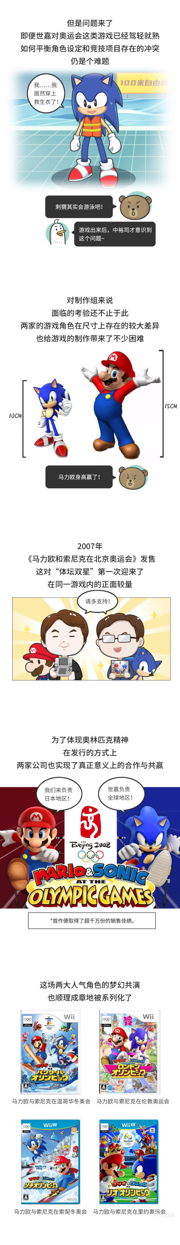而它们的第一次合作就是在象征着和平与友谊的奥运会赛场上。以2008年北京奥运会为背景,在这个游戏的世界里,世嘉和任天堂一同复刻了现实的奥林匹克项目,还另外设计有独特世界观下的梦幻竞技项目,分别来自两支队伍总计16名的选手们首次实现了梦幻共演。从这时开始,它们不再只是普通的游戏角色,更承担了将奥运会文化向年青一层渗入的传播功能。