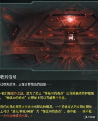 虽然很显然这个宇宙并没有存在过于发达并且接近“30级奇点”的文明,但肃正协议还是通过使用隐秘信号在合成人中进行传播的方法,来对自身进行局部启动。哪怕肃正协议只是部分启动,但其强大的工厂和空间站所生产的源源不断的机械舰队依旧有能力荡平星海。就在星海陷入危机,边缘星球接连沦丧的时候,星海的各个文明的通信频道接入了一条消息。那是赛博勒克斯β发出的,而它则是赛博勒克斯文明所剩余的真正最后的残焰。