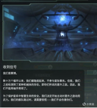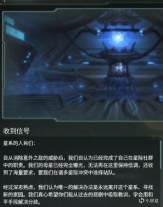 在人们欢庆的时候,在人们打算重新接纳这个古老的机械体文明的时候,科学家发现,赛博勒克斯β的舰队正在向着未知的方向进发,最终消失在宇宙的阴影中,在最后一艘舰船离开时,赛博勒克斯β留下了这样的一段话后便离开了这片星域,去寻找并帮助下一个会遇到的正遭遇危机的星海。