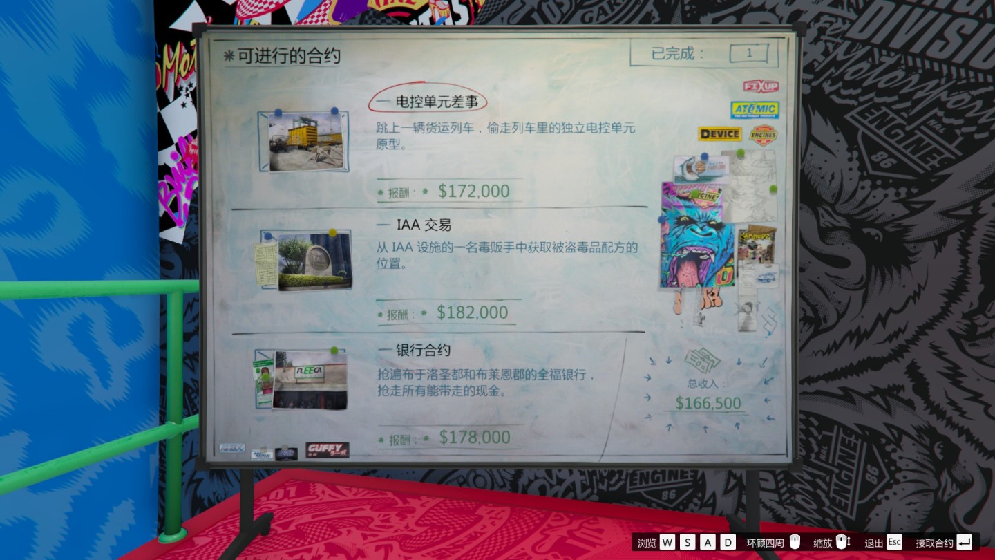 目前已开放的合约有六份,策划板上会随机出现其中三份,每份合约由两个前置任务和最终劫案组成。报酬一般,风格与老抢劫一样主打剧情体验