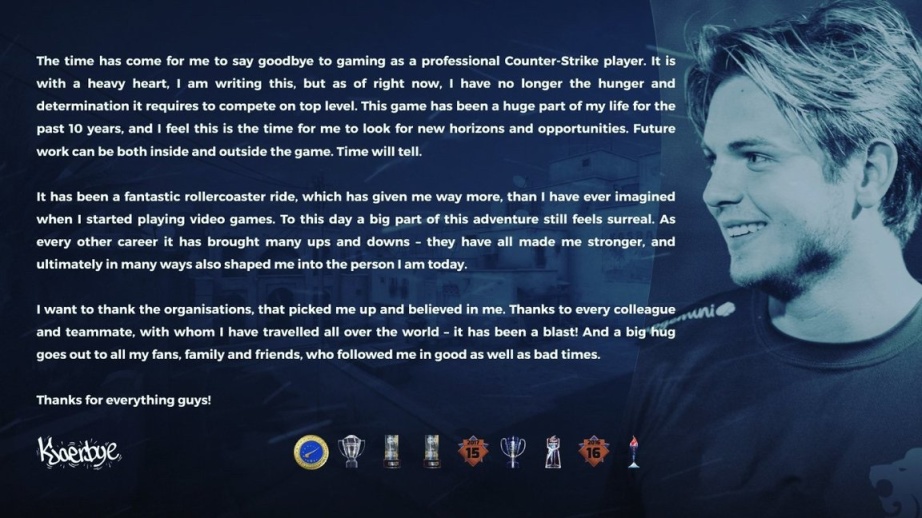 与此同时,Kjærbye宣布他将从职业赛场退役,因为他已经失去了在顶尖水平上竞争的渴望和决心。这位丹麦人曾在2017年随Astralis赢得了ELEAGUE亚特兰大Major冠军,并在18岁时成为赛事MVP。但在意外离开队伍后,他努力回到同样高度的尝试未能成功,最近几年他在North和FaZe的经历没能取得什么成就。