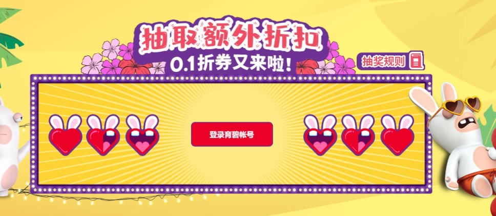 随着今年的ChinaJoy活动,育碧商城也上线了促销活动,单独看折扣比较一般,不过大家记得去抽一下折扣券,和往年的幸运折扣一样登录帐号参与抽奖,最低可以抽到0.1折(当然只有24份),9折、8折券比较多,还可能抽到《刺客信条:英灵殿》黄金版5折券。