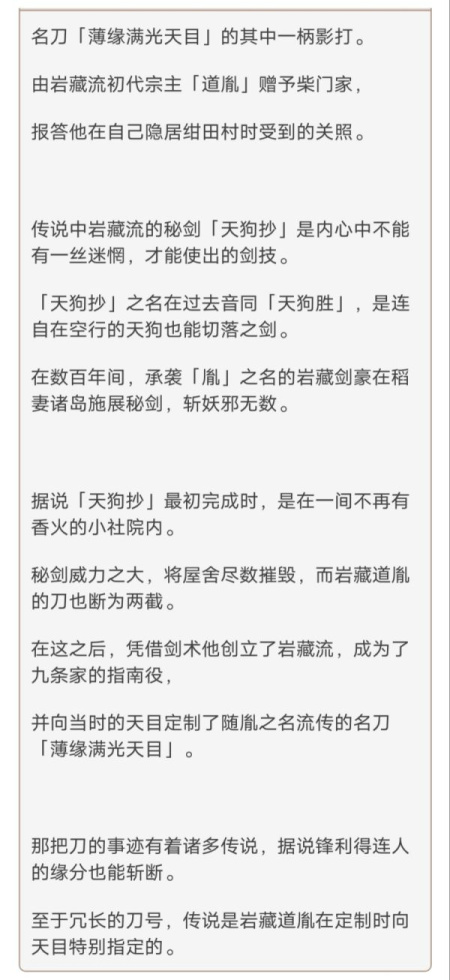 岩藏流的剧情就聊到这里,接下来我们来聊聊原神中岩藏流的由来与剧情中我们获得的「天目影打剑」的相关资料。