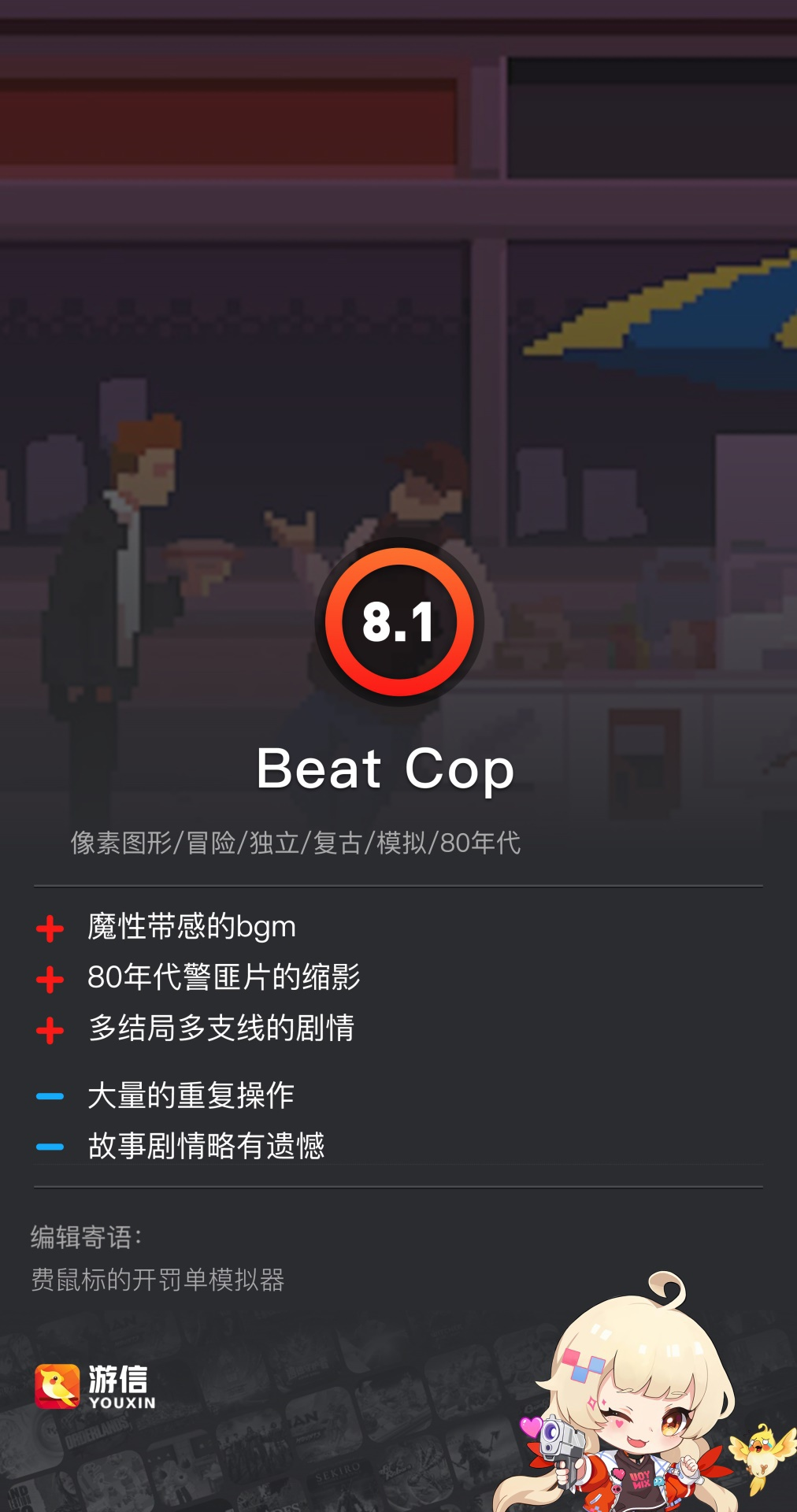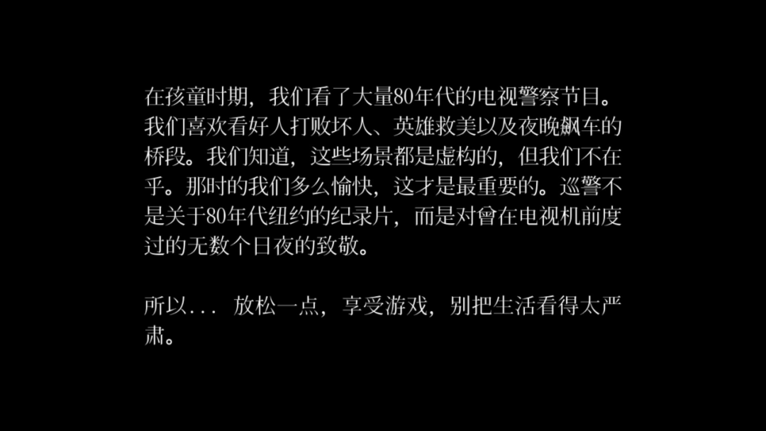 这些细节综合起来,使《Beat Cop》得以仅依靠像素风格的世界就能展现出经历越战惨痛教训后迷乱疯狂的八十年代美国。如同游戏一开始所说的,《Beat Cop》是对80年代美国警察剧集节目的致敬,但八十年代的美国不仅仅只有电视节目。迈克尔杰克逊、雅达利、霹雳舞、夺宝奇兵、施瓦辛格、兰博、变形金刚等等数不胜数的灵感与才华在这十年得以涌现。从这个角度上来说,《Beat Cop》或许更是对八十年代美国本身的致敬。