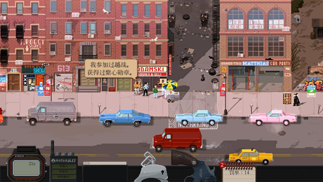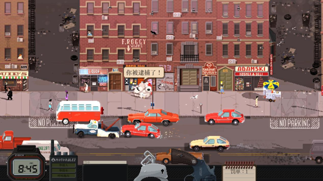 说到本职工作,于游戏中即是完成上司指派的每日罚单任务。玩家需要在自己管辖的这条不安分的纽约街道上对那些不守规矩的车辆进行处罚。有关车辆的罚单事宜可归类为超过停车时间、停错区域(消防通道、禁止停车区域)、车灯与轮胎损坏这四项。另外在大街上玩家也会遭遇到直面劫匪小偷的情况。你需要在警队广播提示你某地发生抢劫事件后火速赶往事发地点,并且在体力槽的限制下赶上小偷、点击手铐,将其绳之以法。