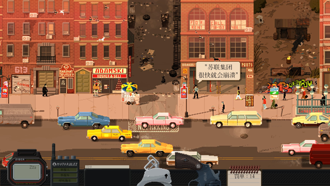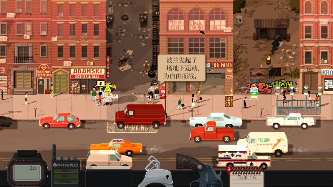 本作还出现了一个与波兰有关的场景对话,即一名来自波兰的男人会找你借10美元以支援波兰出现的地下自由运动。尽管这个地下自由运动大概率指代在历史上占据苏东剧变关键地位,于1981年成立的波兰团结工会,然而突然出现的波兰确实有些让我感到意外,直到后来我了解到制作《Beat Cop》的工作室来自波兰华沙后方才恍然大悟。