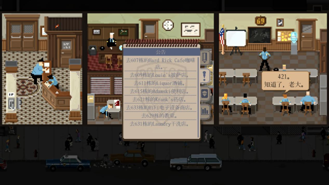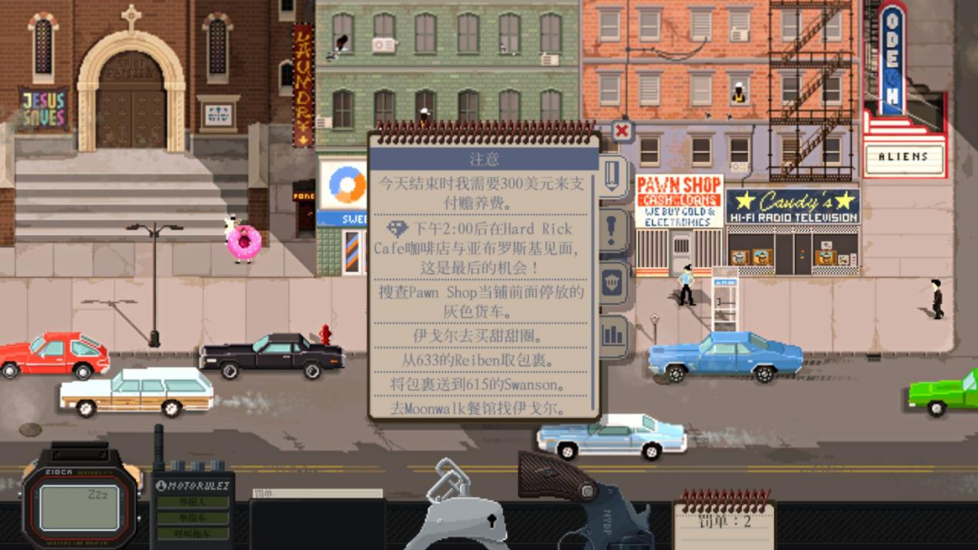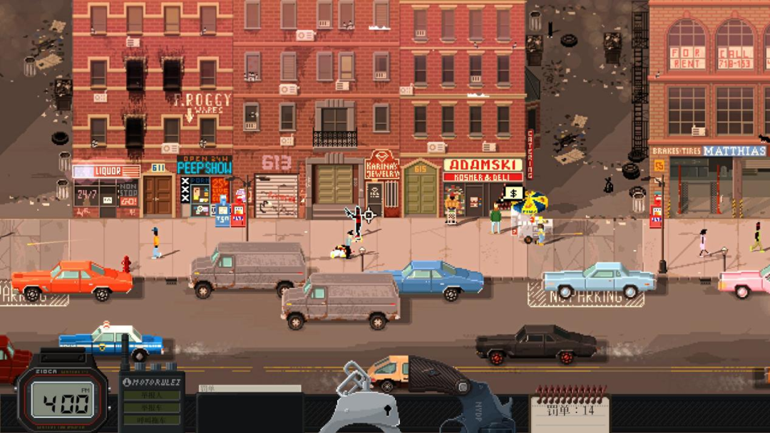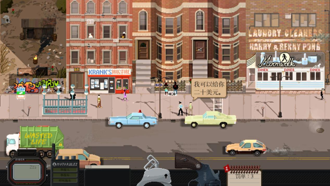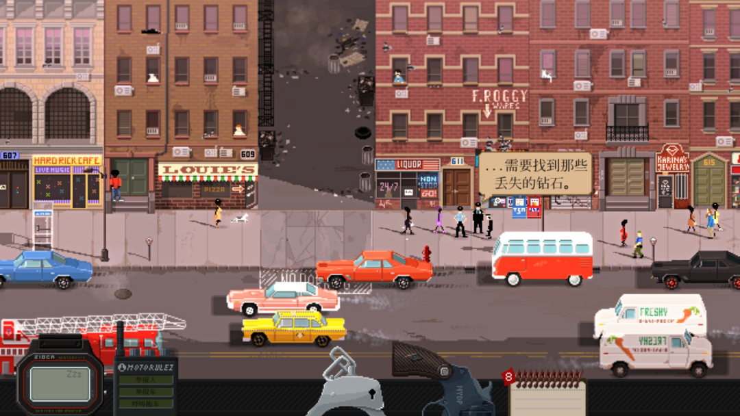 令我感到意外的是,《Beat Cop》中虽然有射击机制,但是整个流程中能用到枪的地方并不算多。这样做的目的可能是为了限制玩家能力从而提高游戏的难度,不过另一方面亦削弱了玩家的代入感,毕竟对于八十年代的美国警察而言,以枪镇暴应该算是常态。