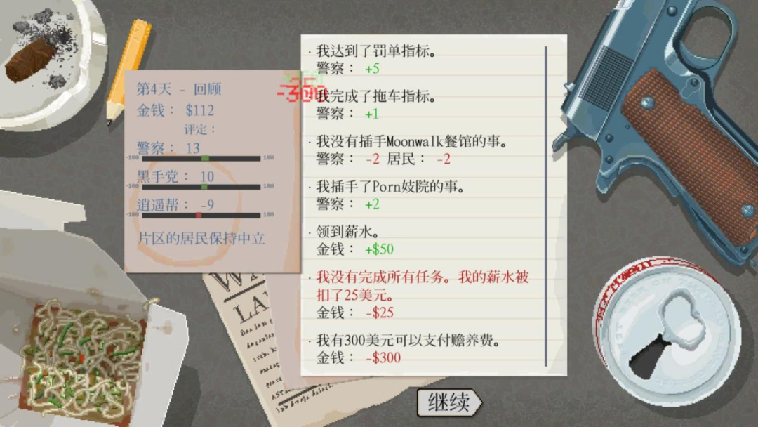 一旦玩家没能熟悉地点或者正确把握任务时间顺序,自己的收入来源和阵营好感度就会被影响。不过比较令我满意的是,本作对金钱的收入判定并没有其他以日常生活循环为核心题材的游戏例如《请出示证件》那么严格。对于金钱数目的要求只是来源于主人公自身必须出纳的赡养费用和与金钱相关的一种结局,然而这笔费用我们可以轻松的通过接受帮派任务去筹集,你还可以收取被罚司机的保护费。只不过这些任务都存在代价,其又与游戏中的另外一个机制好感度系统相关联。