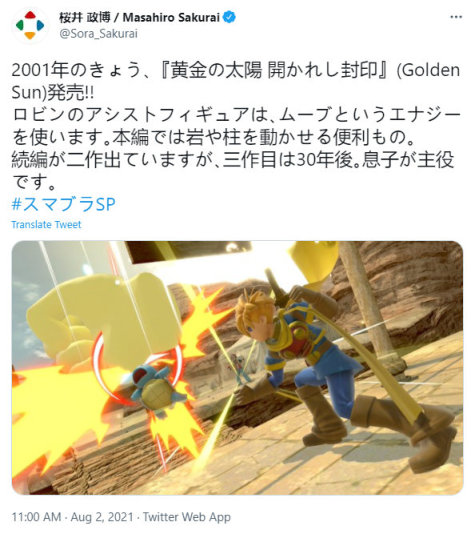 10.今天是GBA游戏《黄金太阳:开启的封印》发售20周年,樱井政博也发推表示了庆祝。