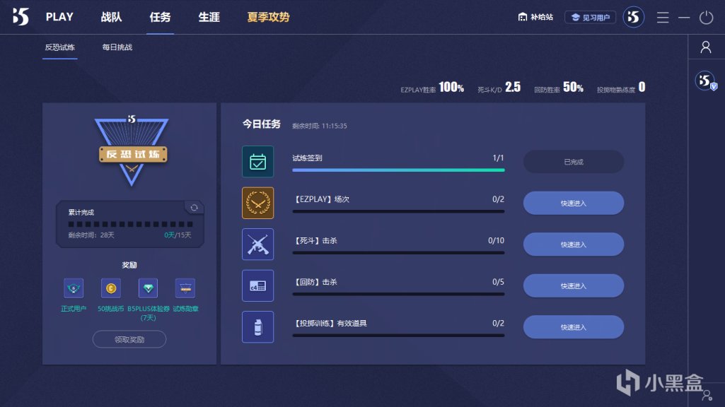 在30天内完成完成15天的试炼还能获得B5 PLUS会员体验券、挑战币及反恐试炼勋章,如果30天没有完成,则任务清零需要重新开启。