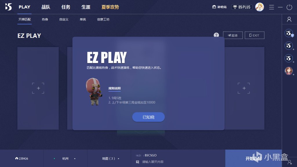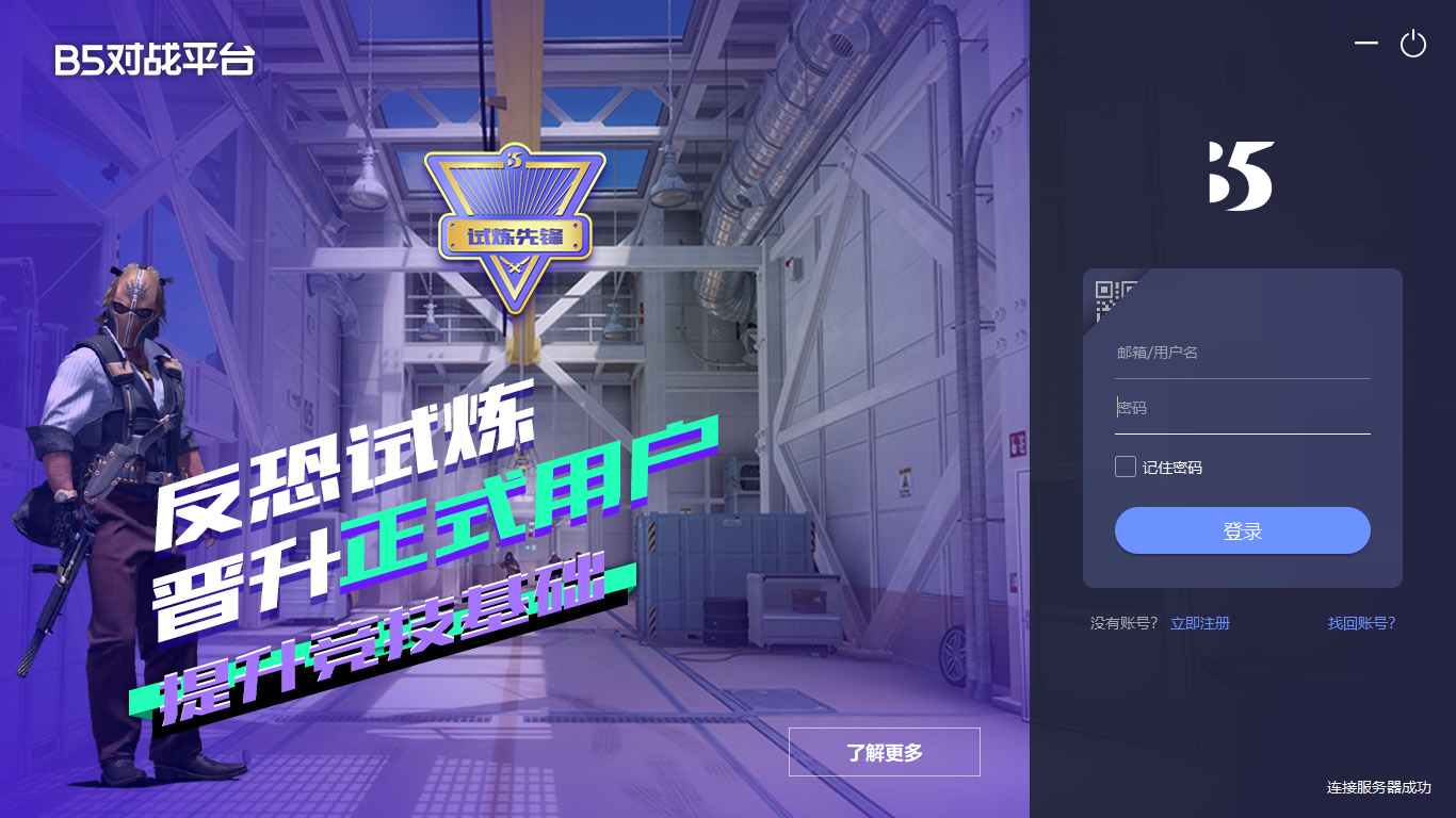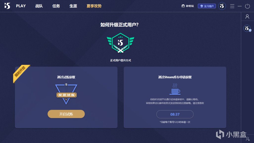 即日起,真实游戏时长> 40h,可注册成为B5对战平台见习用户(暂未拥有天梯匹配资格),而通过反恐试炼任务或Steam库存校验,即可升级为B5对战平台正式用户。